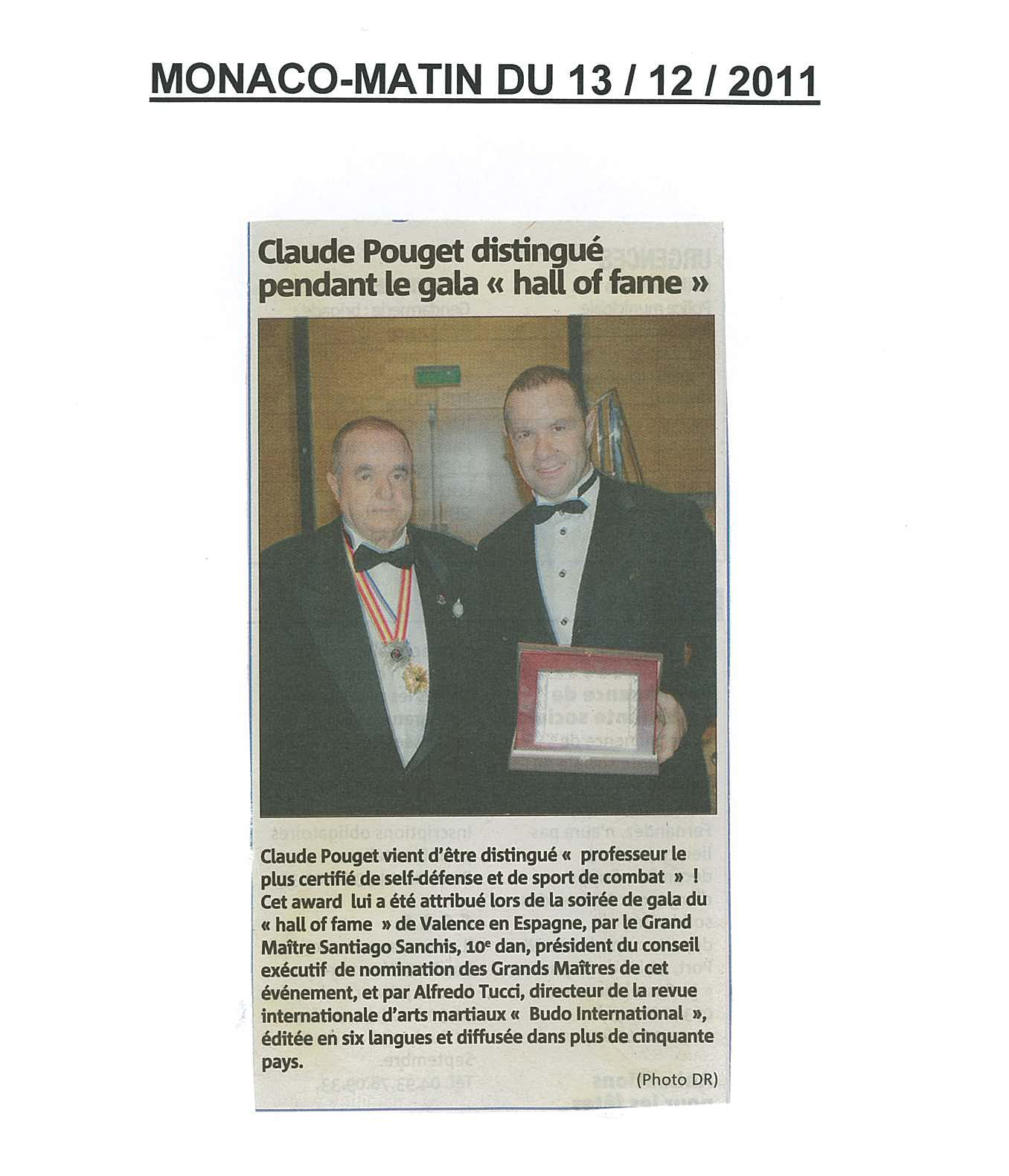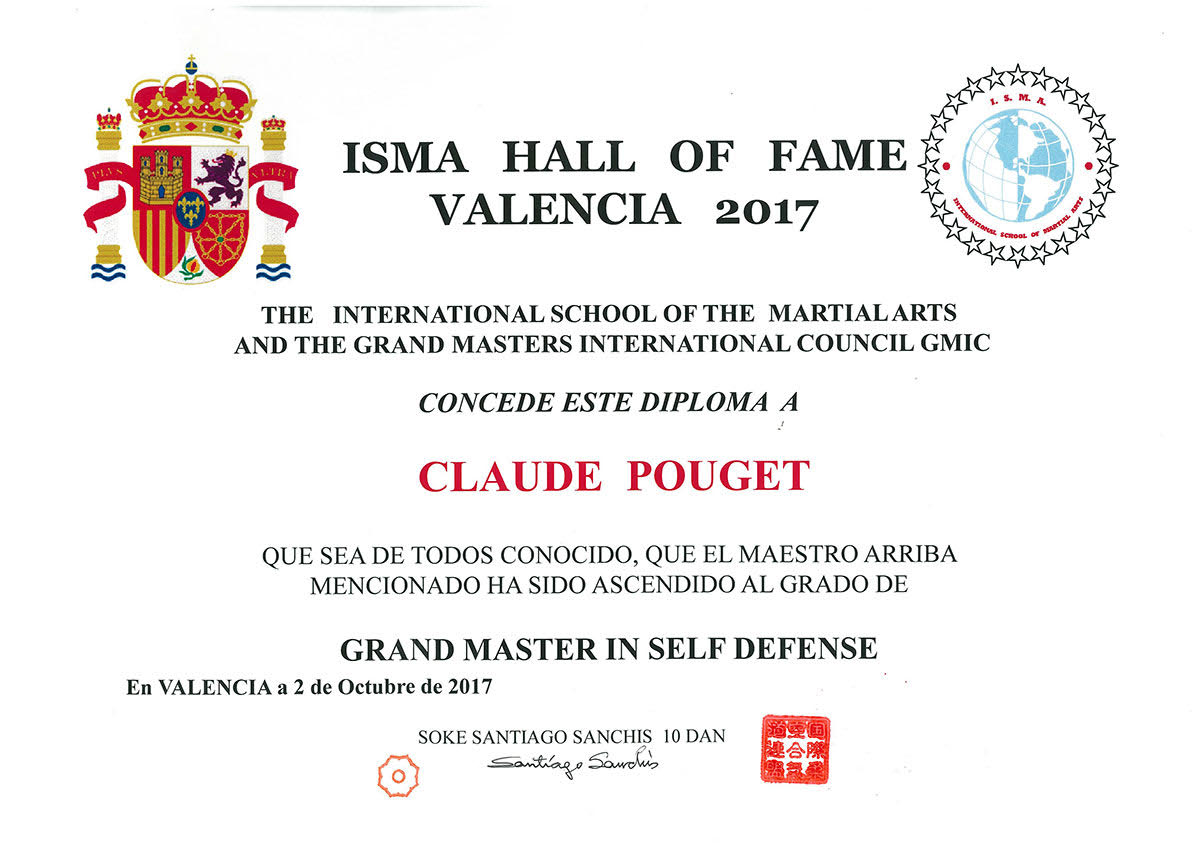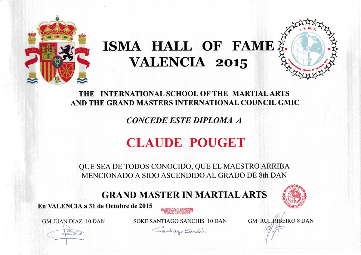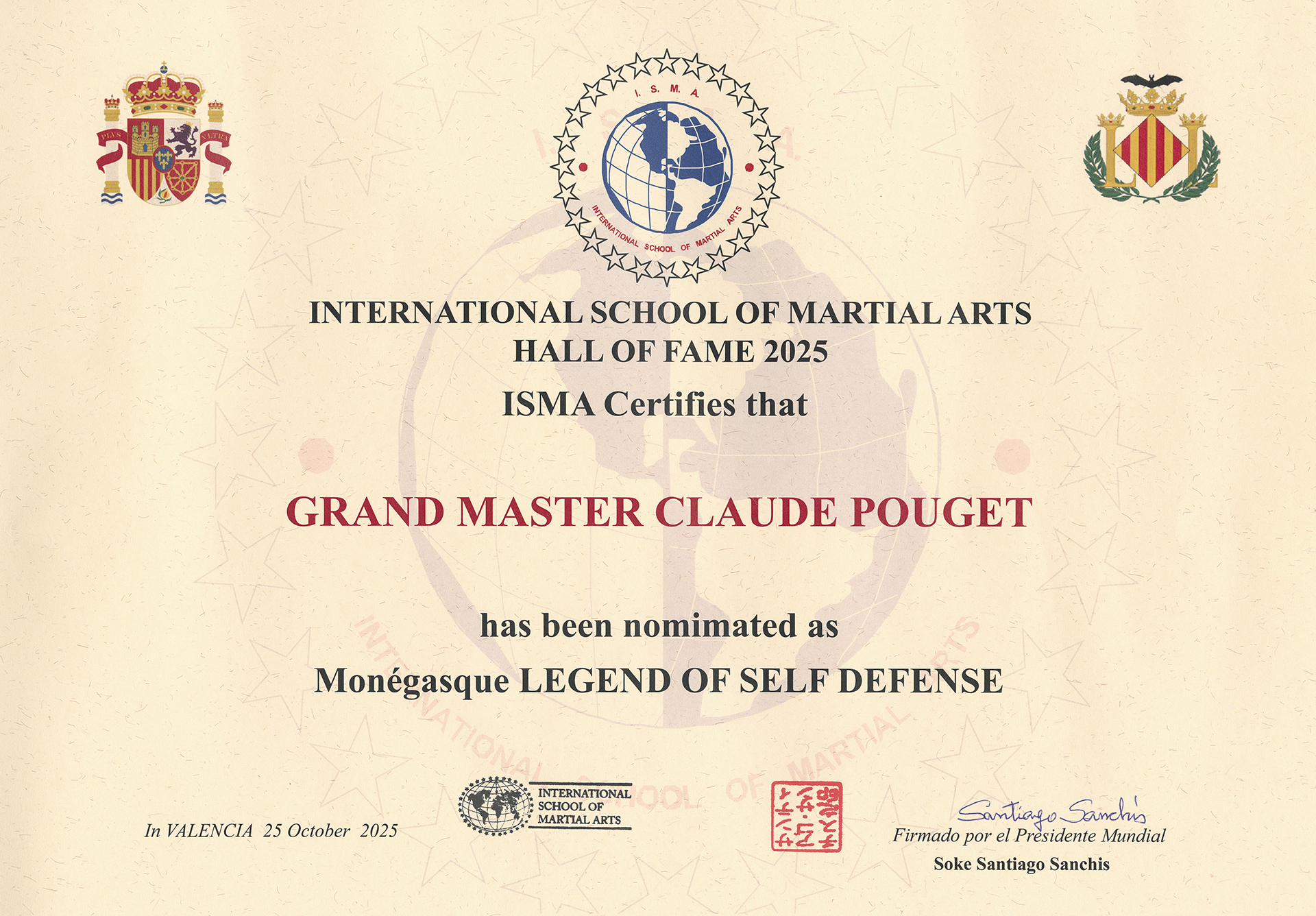 Claude Pouget a été, à plusieurs reprises, honoré, depuis 2010, au « Hall of Fame » de Valence en Espagne, organisé par la Société internationale d’arts martiaux (I.S.M.A.), présidé par le Soke Sanchis, obtenant notamment les distinctions de « Légende monégasque de Self-Defense » (2025) et d’arts martiaux (2023), précédées du grade de 10ème Dan en Self Défense I.S.M.A.(2024), des titres de « Grand Master » d’arts martiaux (2015) et de Self-Défense (2017).