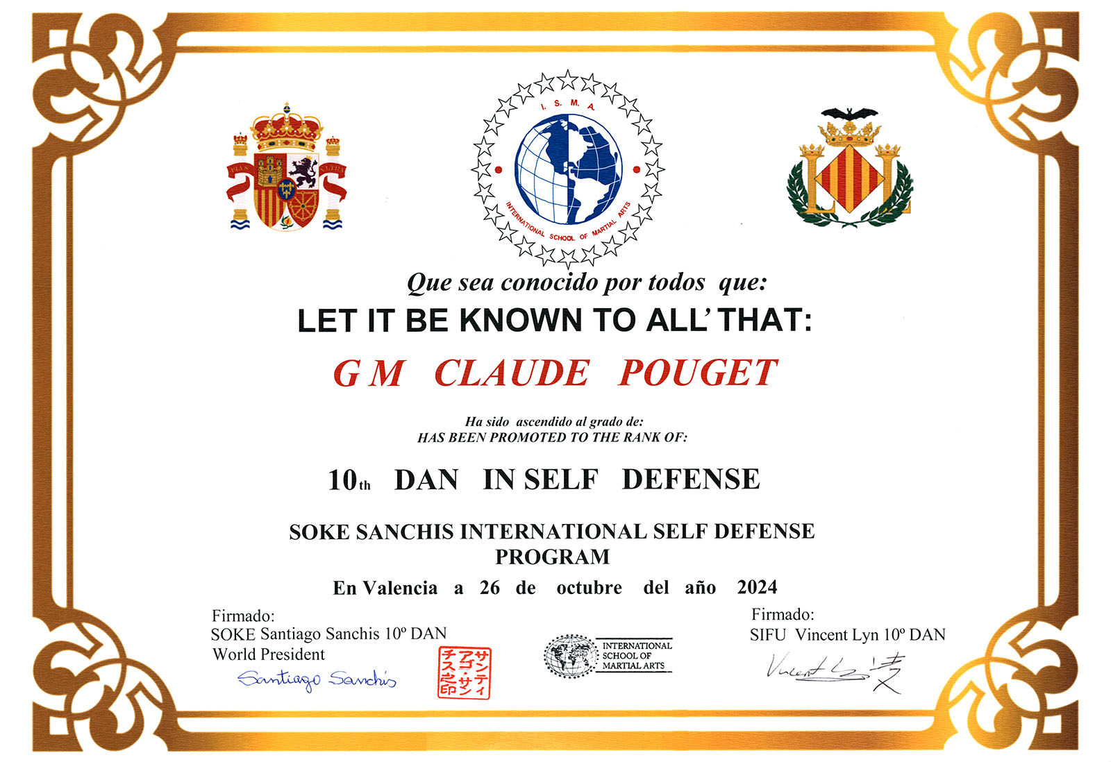 En Krav-Maga, une de ses spécialités, Claude Pouget est Expert certifié (F.F.K), ceinture noire 7ème Dan (un des plus haut grade en Europe), Professeur diplômé Supérieur d’Etat (B.E.2), champion du monde.
